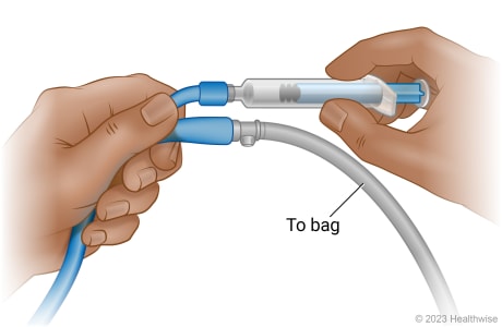 Insert the tip of the syringe into the balloon port on your catheter. Make sure that you know which port is the balloon port. It's not the one where the urine comes out.