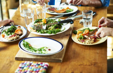 Vegetables and fruits can take up two parts of your plate. These can be fresh, frozen, canned, or dried. And think about using different colours and textures to get a variety of nutrients. What would really pop? Vary the colours or play with texture. Try pairing creamy and cooked with crunchy and raw.