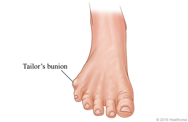 A bunionette, or tailor's bunion, develops at the base of the little toe. When the long bone that connects to the toe (metatarsal) bends away from the foot, the little toe bends inward and the joint swells or enlarges. This results in a bump on the outside edge of the base of the little toe.