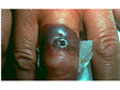 - The bump becomes a painless, fluid-filled blister and later forms a black centre of dying tissue.