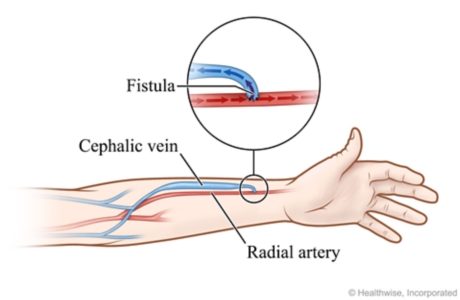 A fistula is created by connecting an artery to a vein in your lower arm. A fistula allows repeated access for each dialysis session.