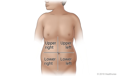 One way to describe the location is to think about your belly as having four sections. With your belly button in the centre, the four sections are upper left, lower left, lower right, and upper right. You can describe the sections from your own point of view.