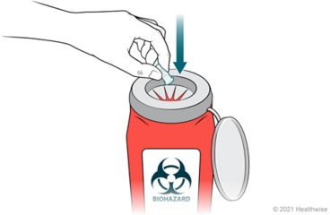 After covering the needle with the outer cap, unscrew the needle. Throw the needle away in a sharps container or other solid plastic container. You can get a sharps container at your drugstore.