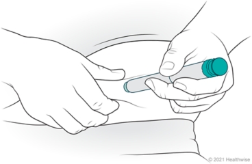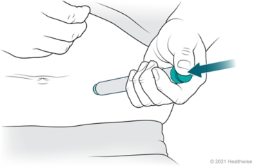 Put your thumb on the injection button, and push it in until it stops. Keep the pen in your skin. Hold the dose knob in for 10 seconds (or to the number that the manufacturer recommends). Then pull the needle out of your skin. Do not rub the area.