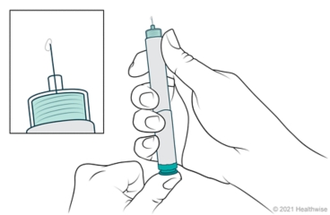 Hold your pen with the needle pointing up. Tap the cartridge holder gently to move any air bubbles to the top. Push the injection button all the way in. Watch for a stream or drop of insulin to come out of the needle. If it doesn't, repeat this step.